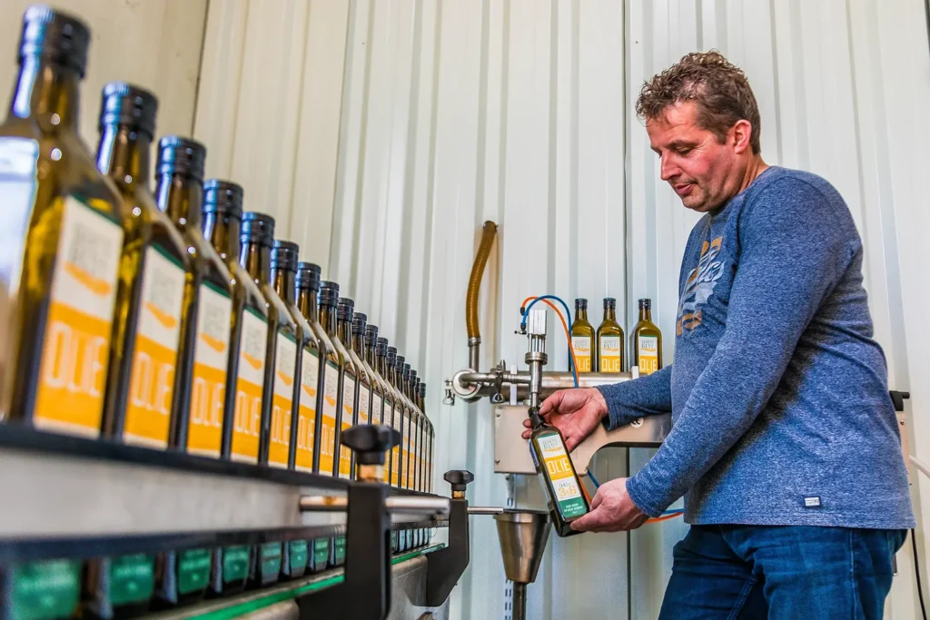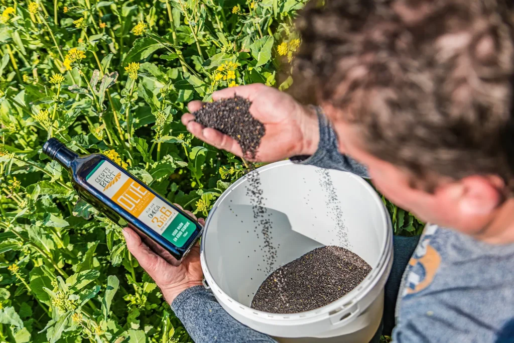 Na het persen blijven de eiwitrijke zaaddoppen over. Die dienen als veevoer voor melkveehouders in de regio. Ook het stro van de koolzaadplant krijgt een tweede leven in de stal. De koolzaadpers in het bedrijf draait op energie van zijn eigen windmolen en zonnepanelen en de tractoren rijden niet op diesel maar op koolzaadolie.